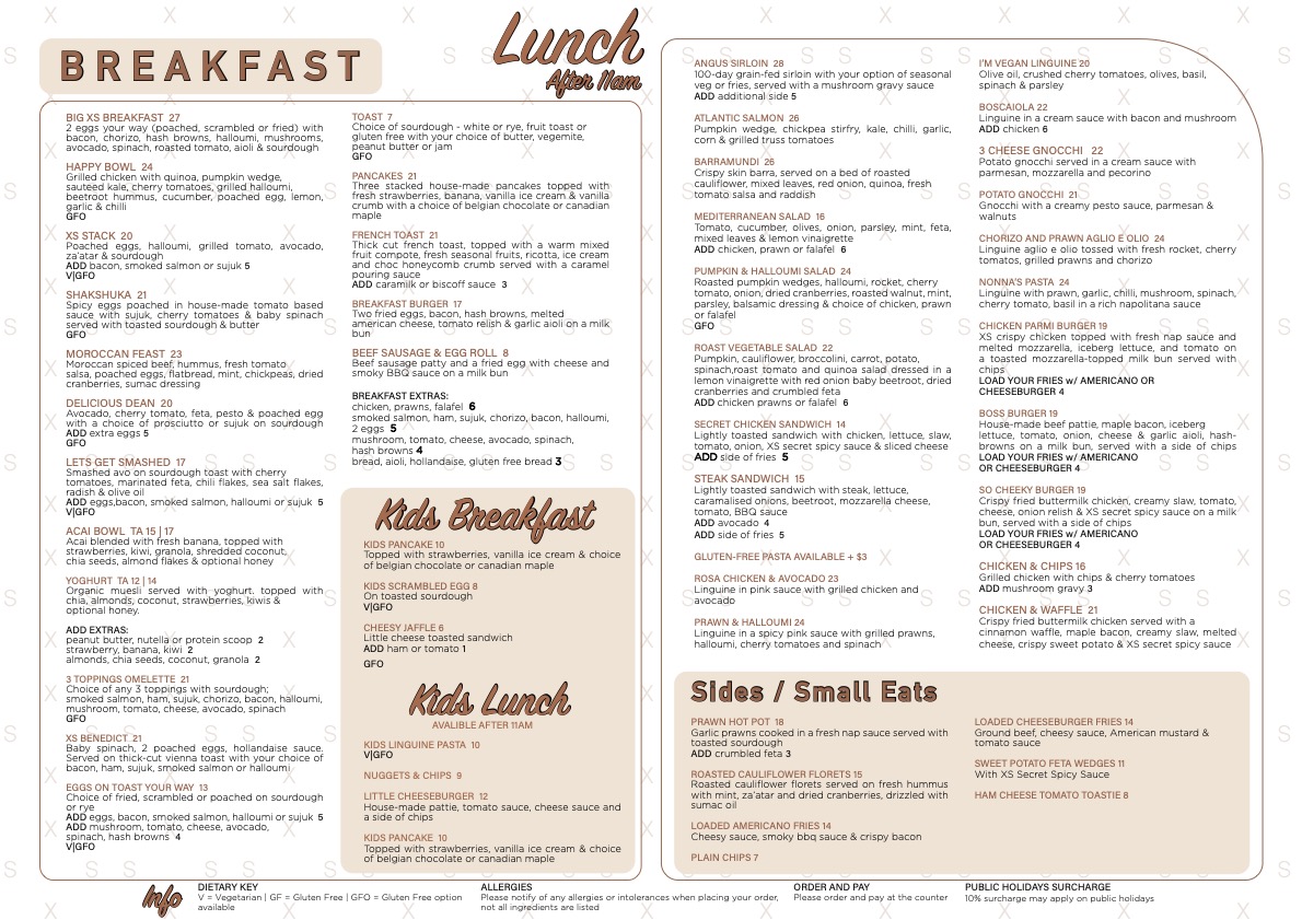 Breakfast items feature classic and contemporary options such as eggs on toast with a choice of egg styles, the XS Benedict served with multiple protein choices, and a Big XS Breakfast that combines eggs with an assortment of sides including bacon, chorizo, halloumi, and avocado.